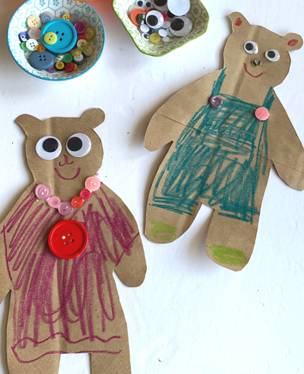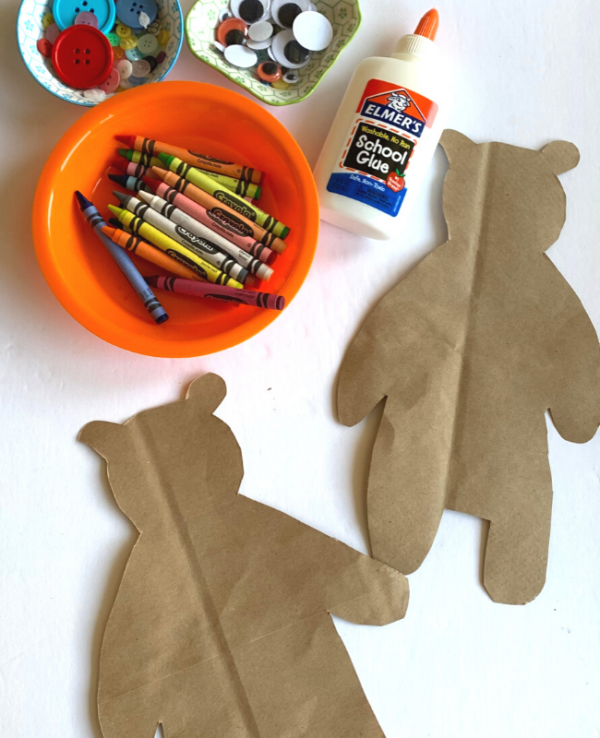 Start by cutting a bear out of a paper bag. I’ve included a plain bear printable in the pack for you to use as a stencil. I encourage you not to print the bear image out. Let your students get as creative as possible with a blank bear.