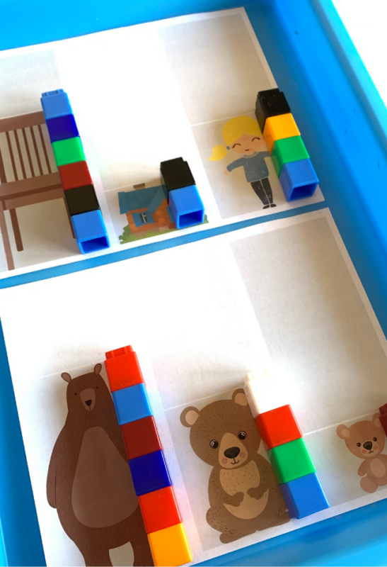 I love Lego. It’s one of the best toys for developing fine motor skills, and kids love playing with it. This is the most straightforward idea, and if you are giving your students individual tray activities, it’s easy to do that with this. Pop some Lego on a tray and invite your students to make some beads for Goldilocks and The Three Bears. The sign seen in the photo is included in the download.