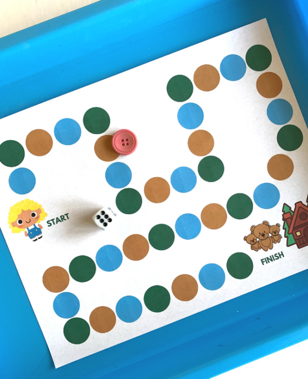 Another math center classic is these simple dice games. You can do it as a roll and cover game or move your marker ( in our case, a button) along as you roll and count. Children will be working on various math skills with this activity; subitizing as they recognize the amounts on the die, one-to-one correspondence as they place the markers down to cover the dots, or count each one to get to their next stop.